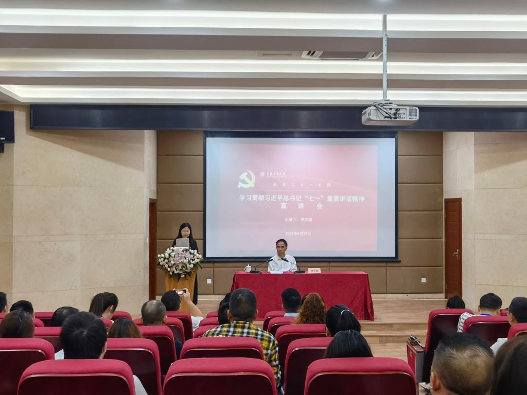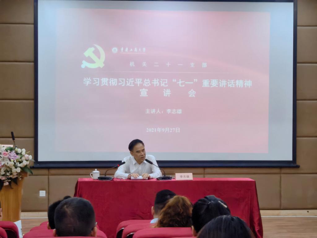 9月27日上午,公司党委书记李志雄教授在江北学术报告厅作了学习贯彻习近平总书记“七一”重要讲话精神宣讲报告,机关二十一支部组织365英国上市公司全体教职工参加了学习,365英国上市公司杜朝辉经理主持报告会。