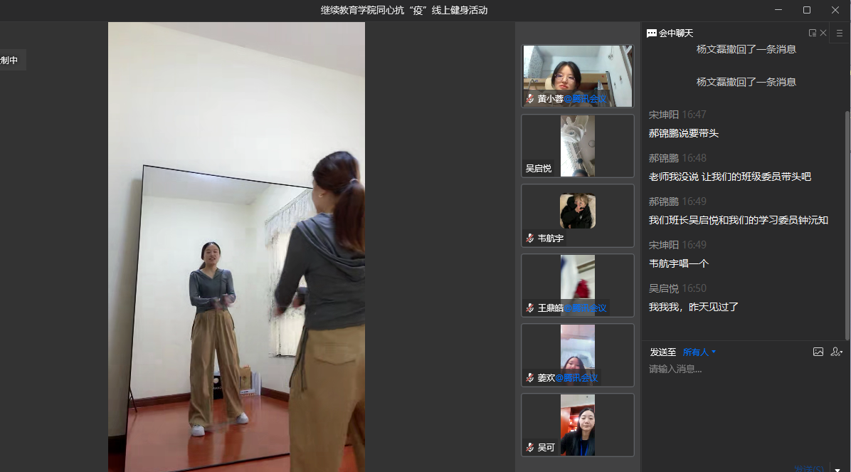 随后,参加活动的师生在公司成慧敏老师的带领下一起跳了健身操,同学们最后兴起,还进行了线上接歌,整个活动氛围轻松融洽。同学们表示,虽然在活动中有的同学还比较腼腆,但大家感受到了公司的用心,也从这几天越来越好的饭菜和送到手上的物资中感受到了公司的温暖,他们一定听从公司的指挥,服从公司的安排,加强锻炼,相信通过大家的共同努力,一定能够战胜疫情。